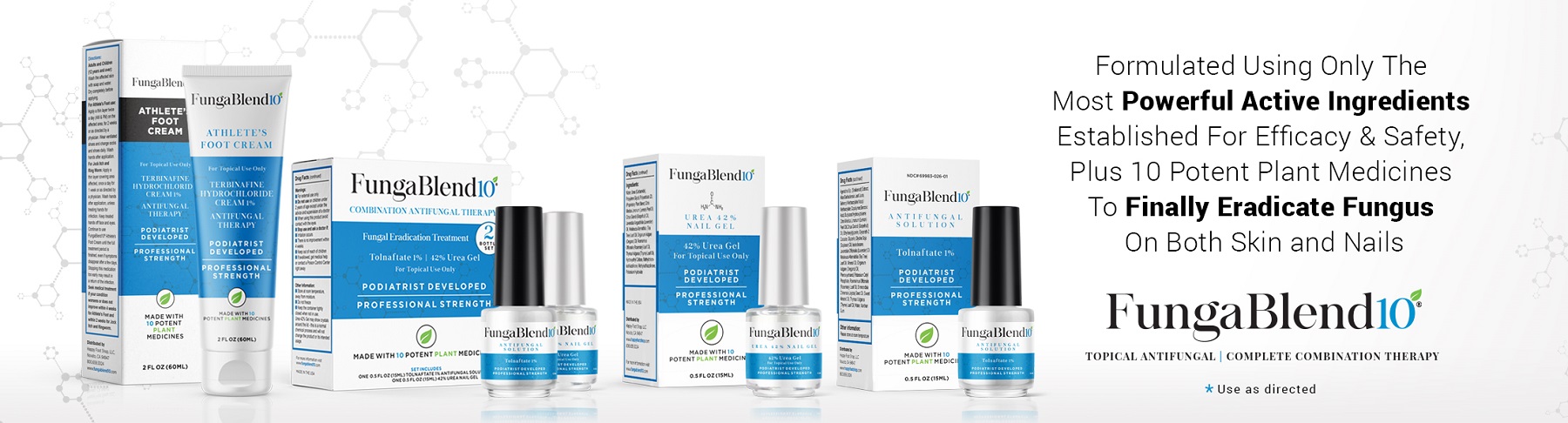 FungaBlend 10® is your trusted source for clinically proven antifungal and nail care solutions. Our podiatrist developed products are formulated with FDA-approved active ingredients and a proprietary blend of 10 powerful plant medicines to treat nail fungus, athlete’s foot, jock itch, and ringworm. FungaBlend 10® offers fast, effective relief and supports healthier skin and nails.